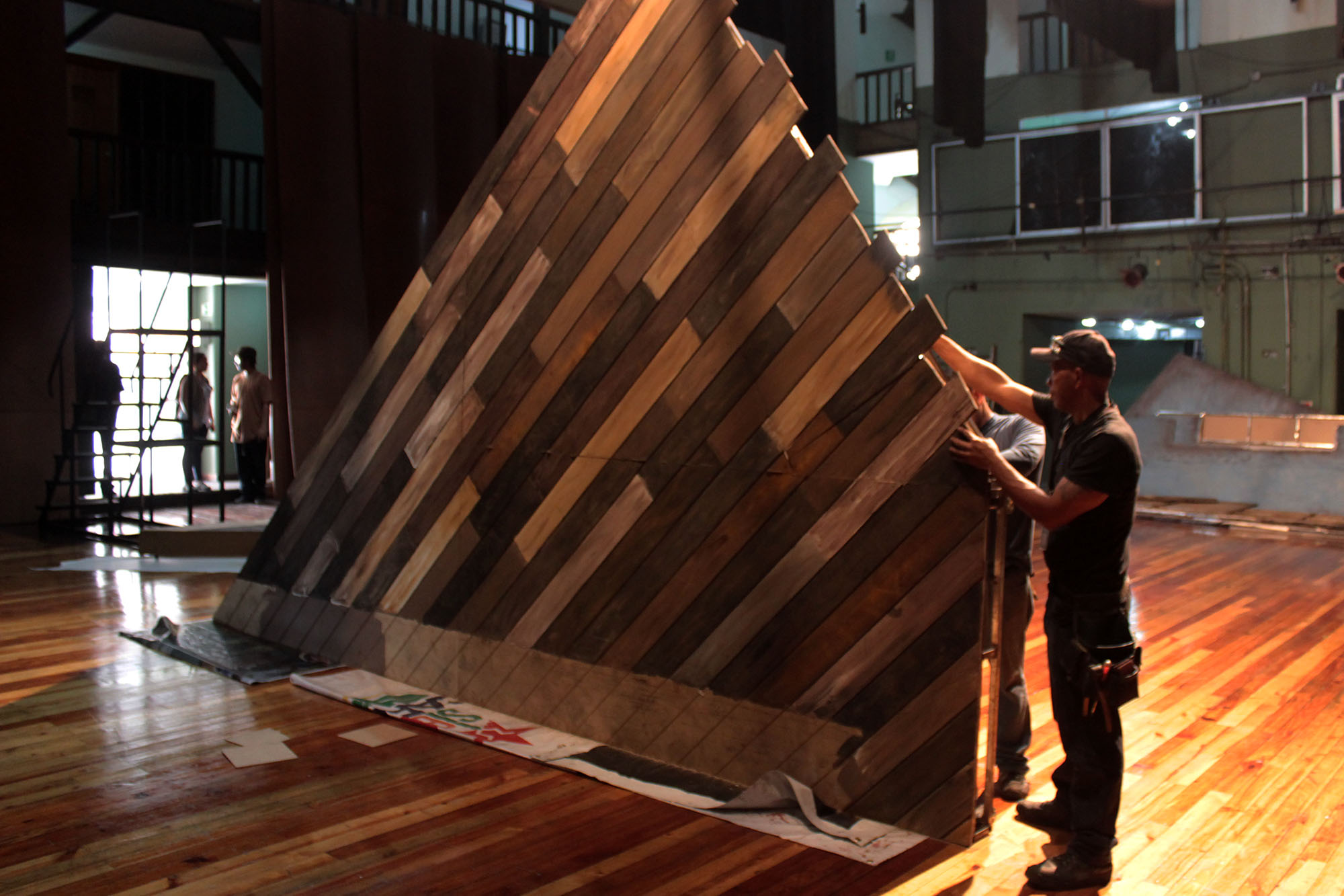 El techo de la pieza inaugural tiene una particularidad, y es que está construido a un ángulo de 45° grados, los herreros se encargaron específicamente de la reconstrucción de este. “Algunos países como Argentina y México, donde se ha presentado la obra, no lo han podido recrearlo, y Venezuela si lo hizo. Este equipo asumió esta edificación, no como una escenografía más, sino como un gran proyecto, que a su vez representaba un enorme reto” así puntualizó Jhonathan Cardona.