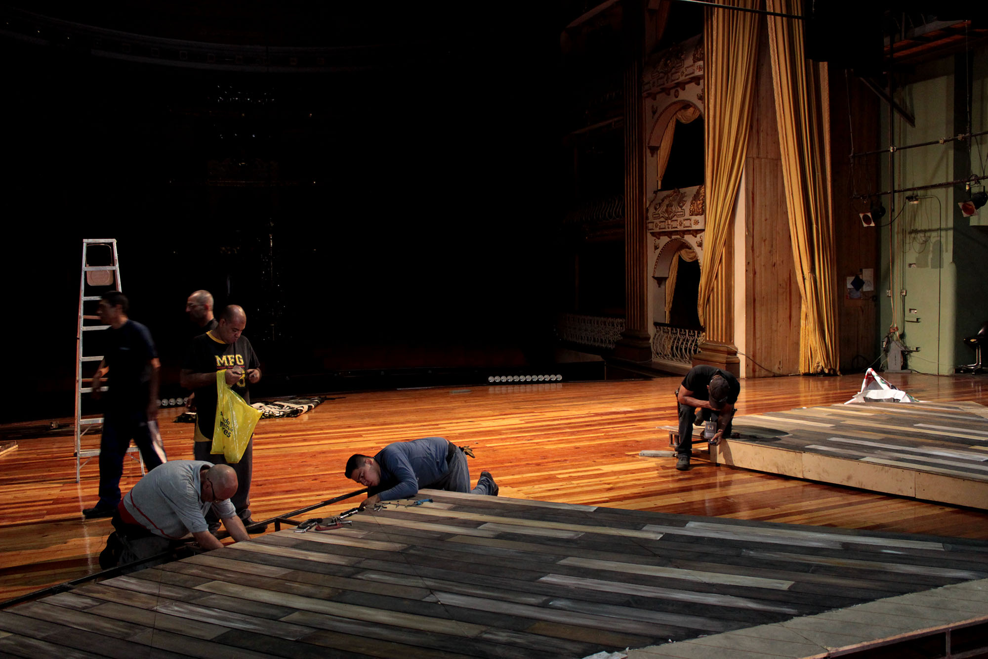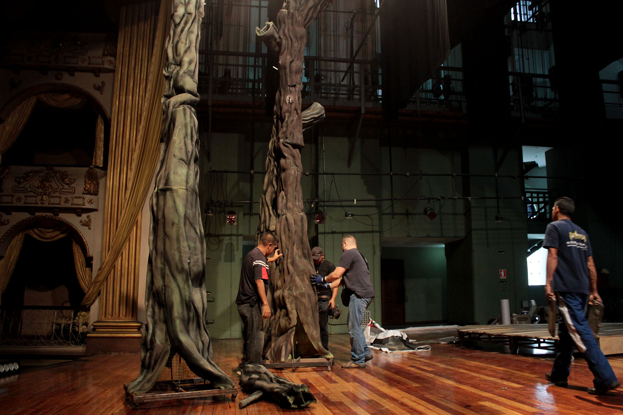 El piso fue otro de los elementos elaborados y calados a mano para conseguir un efecto de profundidad, y así lograr la apariencia de que cada tabla fue colocada una por una. Al mismo tiempo, en los alrededores del escenario también se dispondrán de una serie de árboles, de seis metros de altura, hechos de goma espuma, los cuales fueron armados por Luis Indriago, mejor conocidos por sus compañeros como Fullpapa.